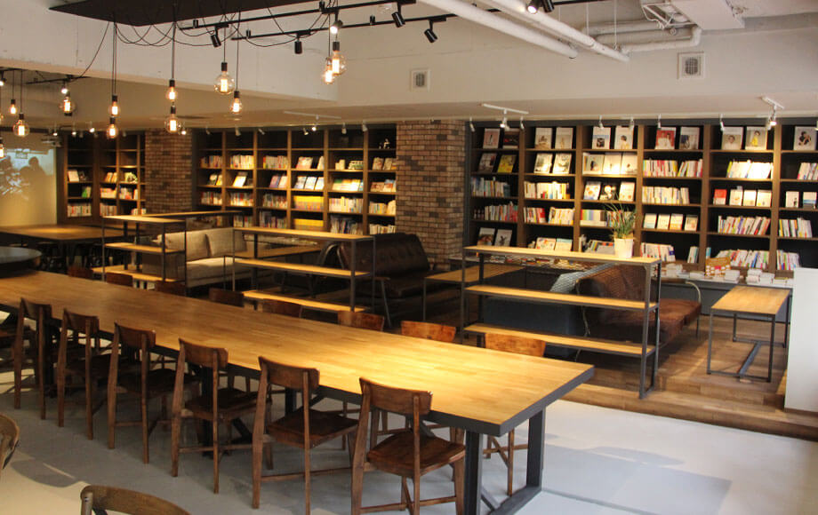 Wi-Fi、電源の設備はもちろん、ほっとひと休みできるカフェスペースにアイデアを喚起する書店を併設。