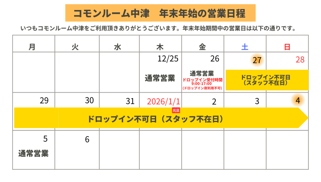 また、ドロップイン(夜利用)の受付は出来かねますのでご注意ください。