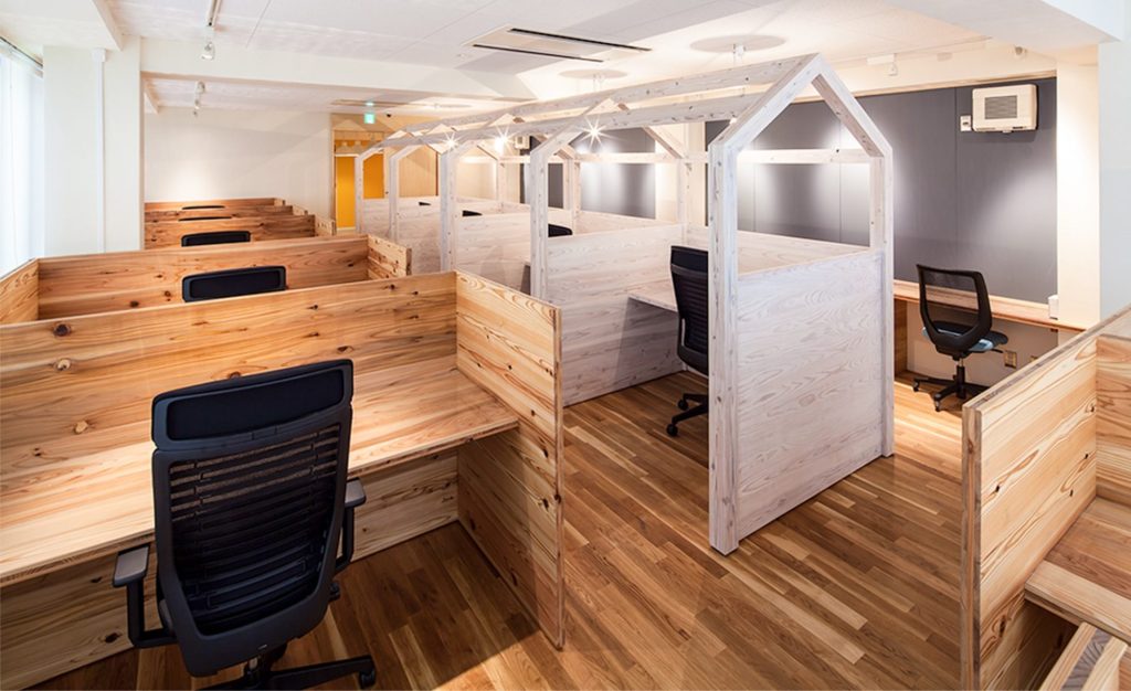 木目調のコワーキングスペースも居心地良く利用していただけます。