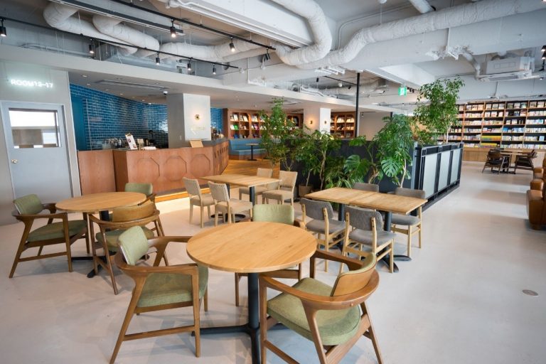 SPACE KANTE KYOTOはカフェの雰囲気を感じながら勉強できる、木の温もりが心地よいコワーキングスペースです。「カフェラウンジ」は、どの席でも通話や食事ができます。